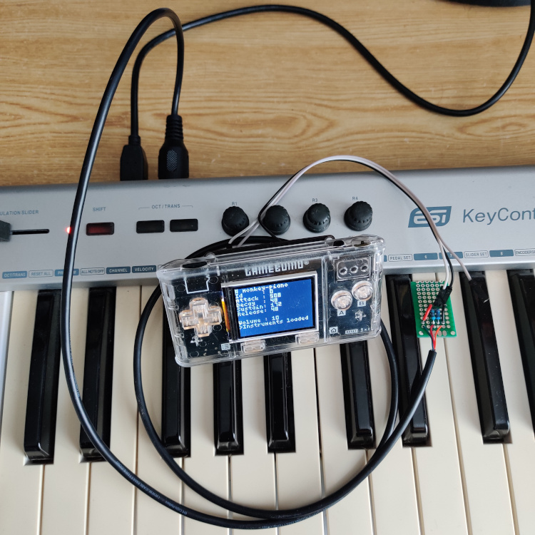 I've been playing with my digital piano once a while; although it has a few instruments, I felt I could use its midi output to play sounds from the 80's generated by a software synthesizer I could write, running on some cheap microcontroller. I eventually implemented a basic synthesizer for the Gamebuino, a little console embedding a Microchip SAMD21 microcontroller, with a 32 bits ARM Cortex M0+ CPU, 256 KB of flash and 32 KB of RAM. The console is conveniently shipped with a development interface exposing USART pins, an audio output jack, a battery, a TFT screen, a micro SD card drive and a few buttons. This article will focus on the midi interface; i.e how to connect a midi keyboard to a microcontroller (or a computer).