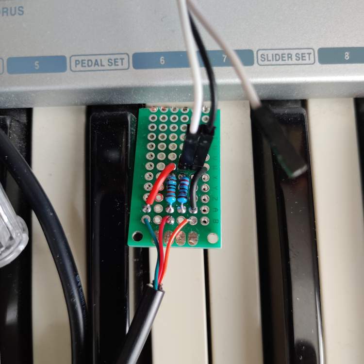 While the DIN connector is plugged into the instrument's midi output, the Dout wire needs to be connected to the microcontroller's UART RX pin and GND to its ground (see schematic above). Et voilà, notes played on the MIDI keyboard merryly flow to the microcontroller, who can play the corresponding square waves.